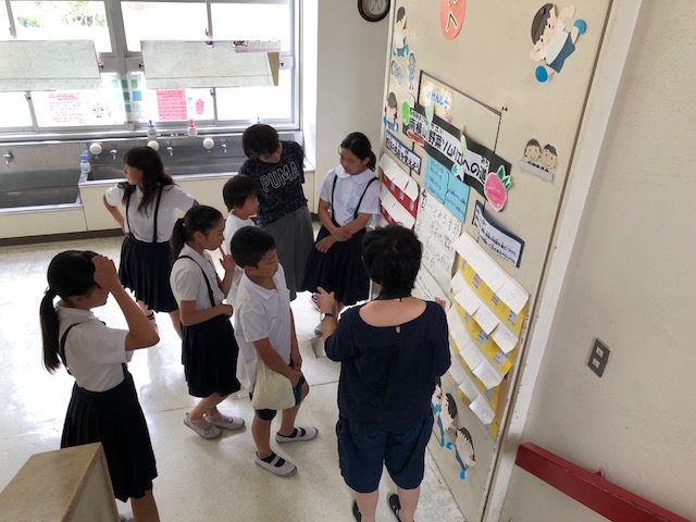 先生方から「夏休みの過ごし方」について。体育委員会から「水泳記録会」に積極的に参加しようという話。保健委員会からは、野菜ソムリエのワッペン贈呈。給食委員会からは、残量が少なかった学年に表彰、をそれぞれ行ってもらいました。